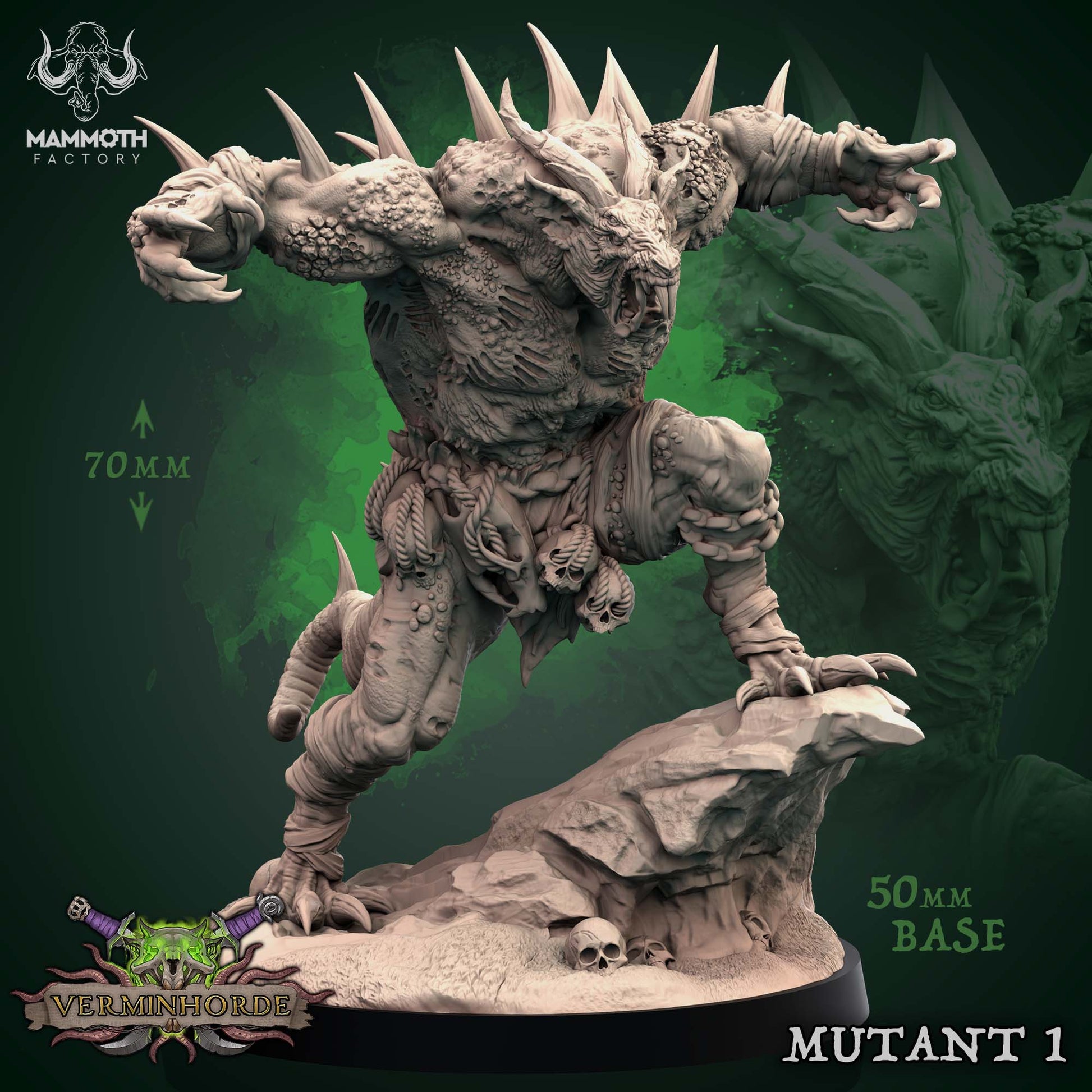 A towering mass of muscle, fur, and weeping sores, the creature is part man and part rat, and covered in jutting bone spines. Long, goatlike horns protrude awkwardly from its skull, and an extra set of eyes stare unblinkingly from the side of its face.
